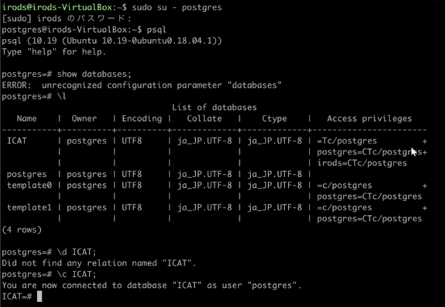 - If the iRODS environment issues and networking issues have been ruled out, the iRODS server/client logs may provide additional information with regards to the specifics of the error in question.サーバーログは、rodsLogで確認できます。 https://docs.irods.org/master/system_overview/troubleshooting/#the-server-log-rodslog からの説明↓The Server Log (rodsLog)The iRODS server log (rodsLog) is the best place to find a history of what has happened and any error codes and file paths that may explain unexpected behavior. The rodsLog is found at /var/lib/irods/log/rodsLog*. The rodsLog is rotated every few days, so make sure you're looking at the latest file for recent error messages. The debugging level (below) affects how many messages are written to the rodsLog.実際は、/var/lib/irods/log/に入ると、以下のようなファイルが見えます。そこで、一番最新のログファイルを、以下のコマンドで開いてみました。vim rodsServerLog.2022.02.21その結果がこれです。Feb 25 20:04:51 pid:13044 remote addresses: 127.0.0.1, 192.168.56.2 ERROR: _rcConnect: connectToRhost error, server on 192.168.56.1:1247 is probably down status = -347000 USER_SOCK_CONNECT_TIMEDOUTFeb 25 20:04:51 pid:13044 remote addresses: 127.0.0.1, 192.168.56.2 ERROR: [create_physical_file_for_replica:115] - rsFileCreate failed [error_code=[-347000], path=[/tempZone/home/alice/training_jpgs/waffle.jpg], hierarchy=[newResc]]Feb 25 20:04:51 pid:13044 remote addresses: 127.0.0.1, 192.168.56.2 ERROR: [create_new_replica:505] - l3Create failed [error_code=[-347000], path=[/tempZone/home/alice/training_jpgs/waffle.jpg], hierarchy=[newResc], physical_path=[/var/lib/irods/new_vault/home/alice/training_jpgs/waffle.jpg]]Feb 25 20:04:51 pid:13044 WARNING: [unlock_impl:214] - failed to restore status for replica because no original status found in data_status column. Setting replica status to stale. [data_id=[10028], repl_num=[1]]Feb 25 20:04:51 pid:13044 remote addresses: 127.0.0.1, 192.168.56.2 ERROR: [restore_replica_statuses:122] - failed to restore status for replica; original status not found in data_status column [data_id=[10028], repl_num=[0]]Feb 25 20:04:51 pid:13044 remote addresses: 127.0.0.1, 192.168.56.2 ERROR: [replicate_data_object:748] - failed to replicate [/tempZone/home/alice/training_jpgs/waffle.jpg]Feb 25 20:04:51 pid:13044 NOTICE: rsDataObjRepl - Failed to replicate data object. status:[-347000]